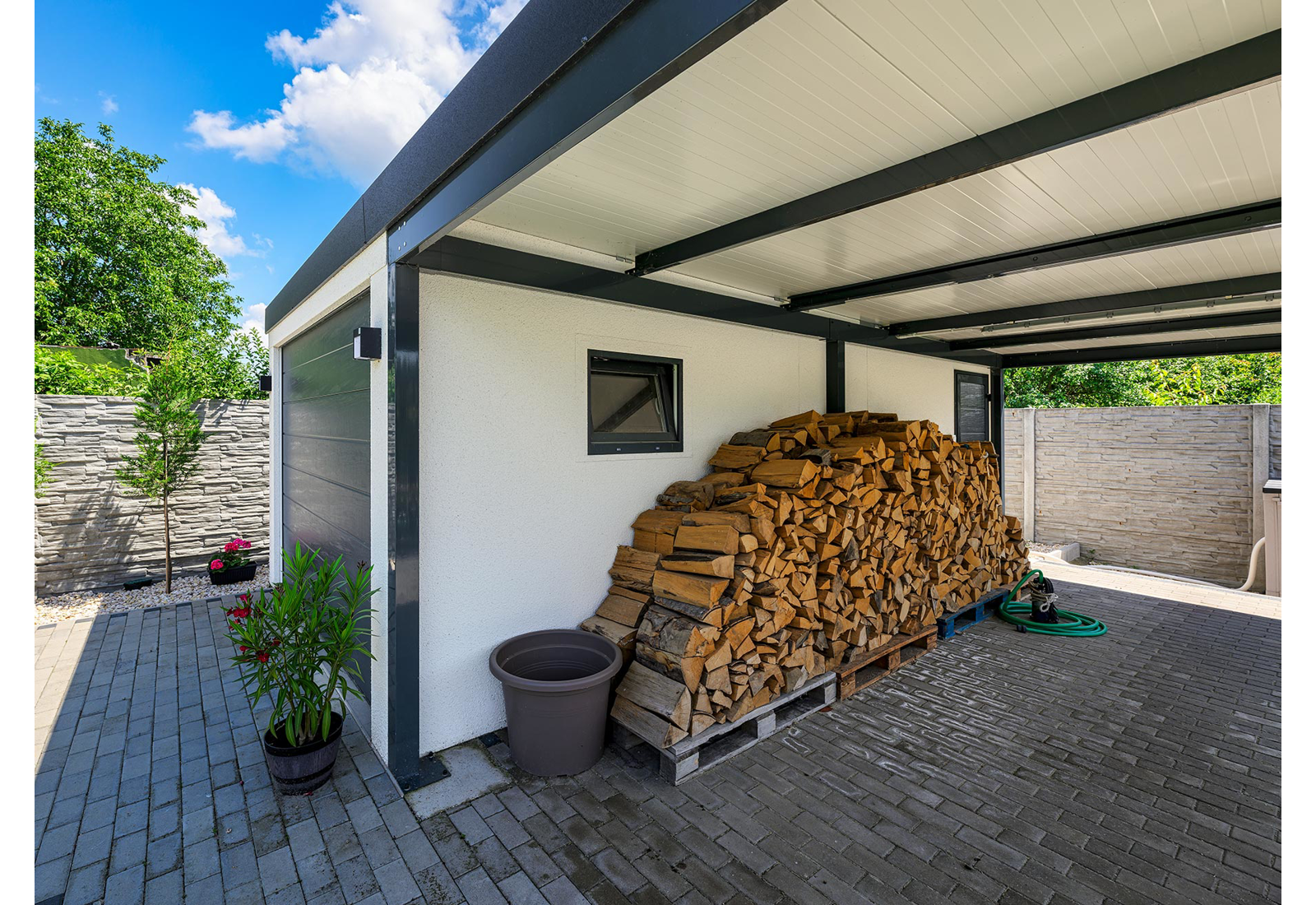 Garáž snů existuje! Prostorná montovaná garáž se špičkovými garážovými vraty Hörmann má zabudované osvětlení a lze ji napájet solárními panely. Bezpečnostní vrata se šikovně zavírají ke stropu, čímž šetří místo. Ultratiché otevírání a zavírání vrat je skvělým bonusem.