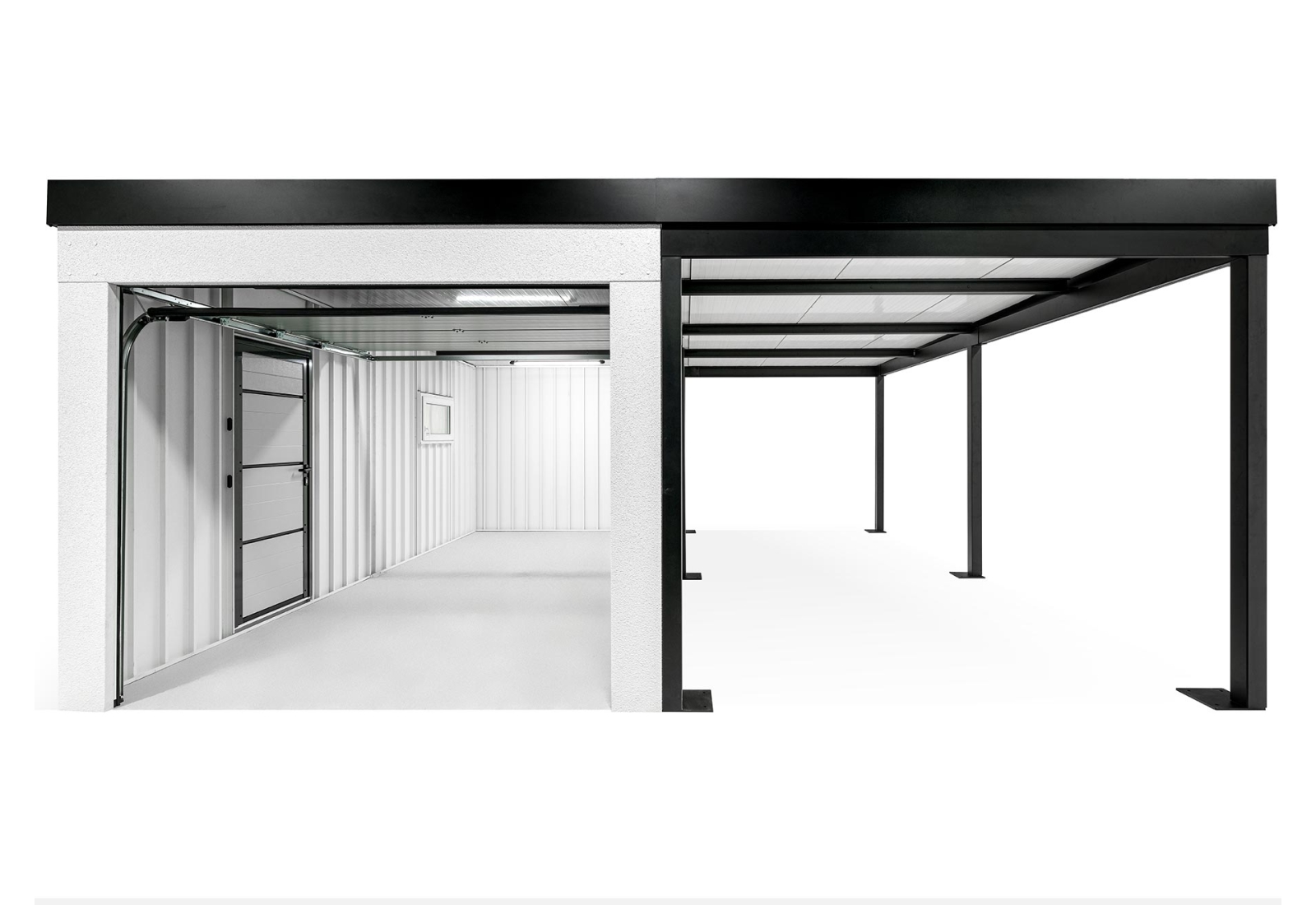 Garáž snů existuje! Prostorná montovaná garáž se špičkovými garážovými vraty Hörmann má zabudované osvětlení a lze ji napájet solárními panely. Bezpečnostní vrata se šikovně zavírají ke stropu, čímž šetří místo. Ultratiché otevírání a zavírání vrat je skvělým bonusem.
