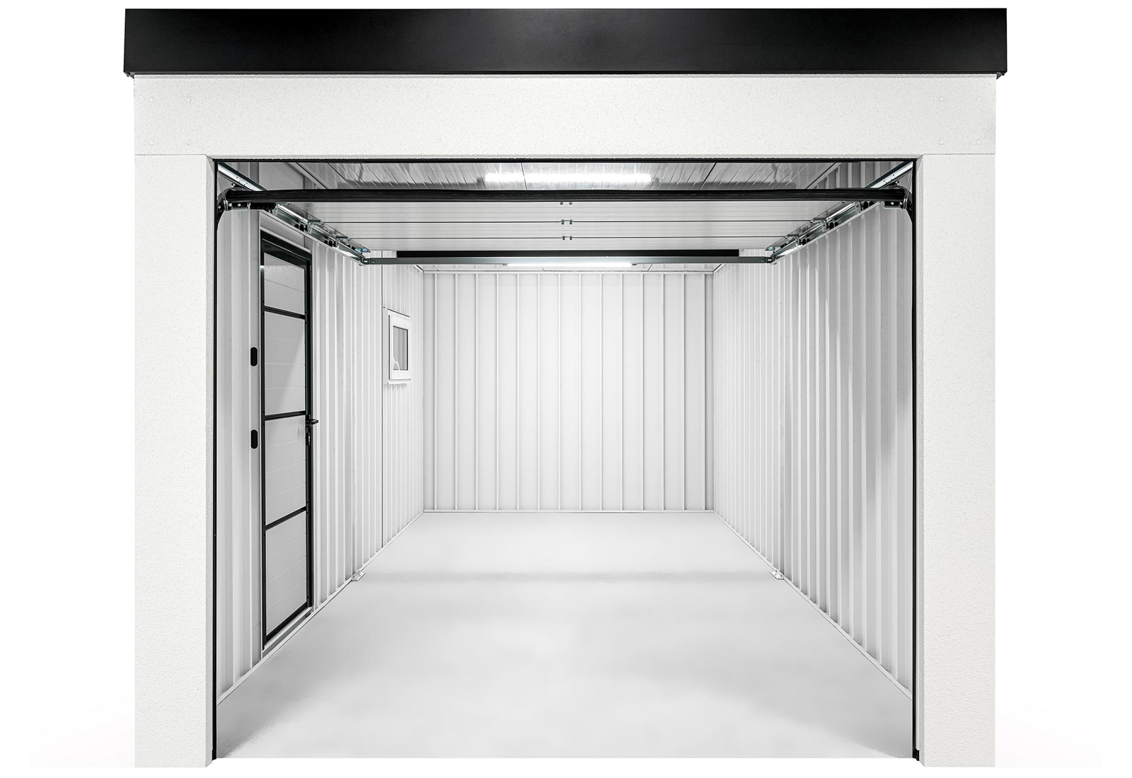 Garáž snů existuje! Prostorná montovaná garáž se špičkovými garážovými vraty Hörmann má zabudované osvětlení a lze ji napájet solárními panely. Bezpečnostní vrata se šikovně zavírají ke stropu, čímž šetří místo. Ultratiché otevírání a zavírání vrat je skvělým bonusem.