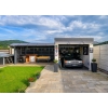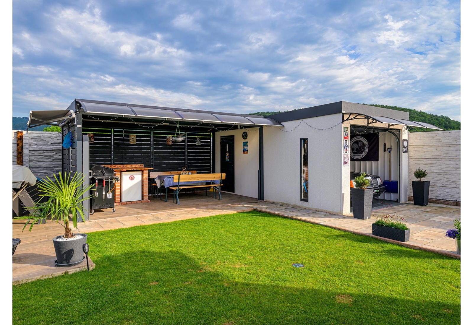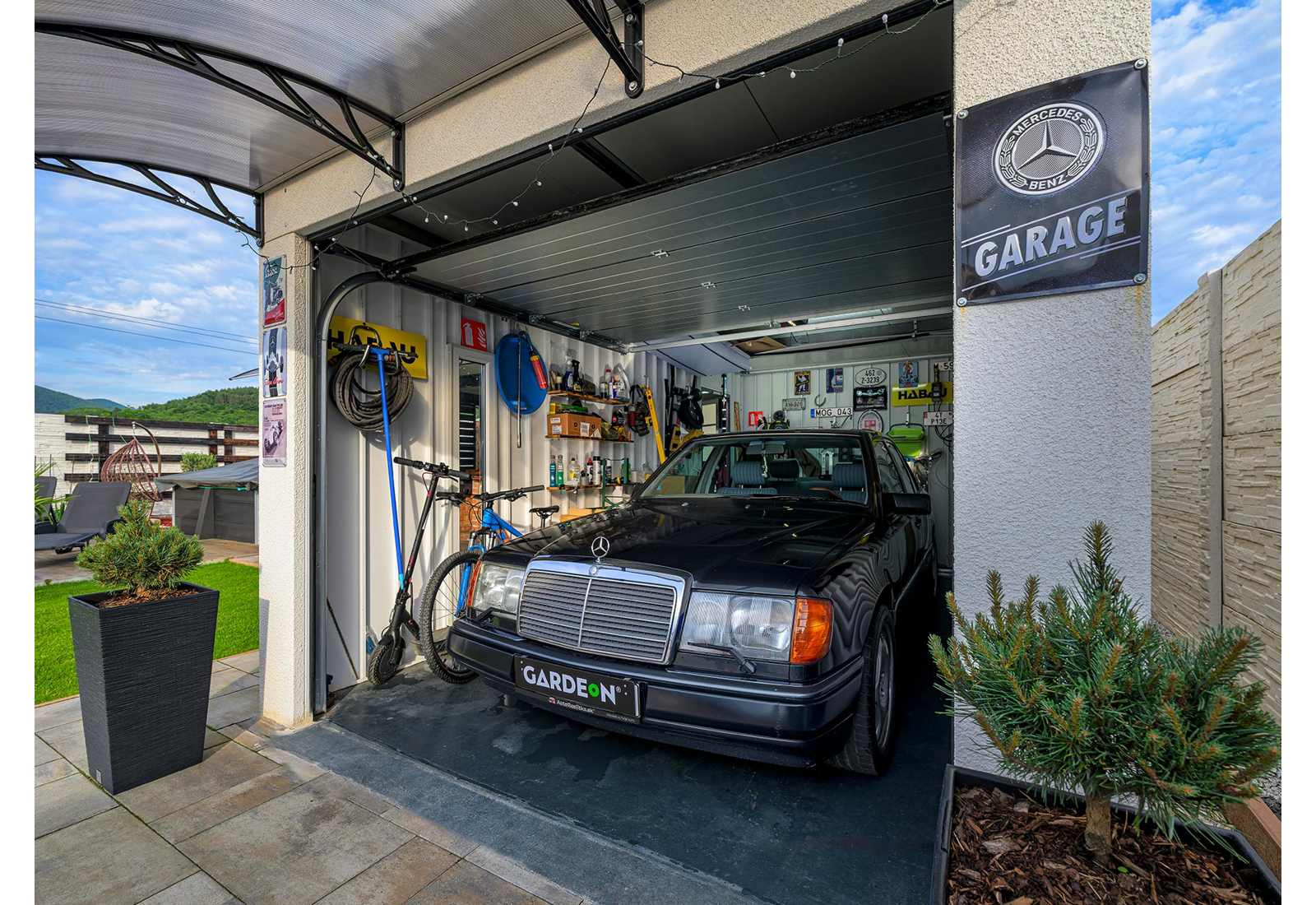 Garáž snů existuje! Prostorná montovaná garáž se špičkovými garážovými vraty Hörmann má zabudované osvětlení a lze ji napájet solárními panely. Bezpečnostní vrata se šikovně zavírají ke stropu, čímž šetří místo. Ultratiché otevírání a zavírání vrat je skvělým bonusem.