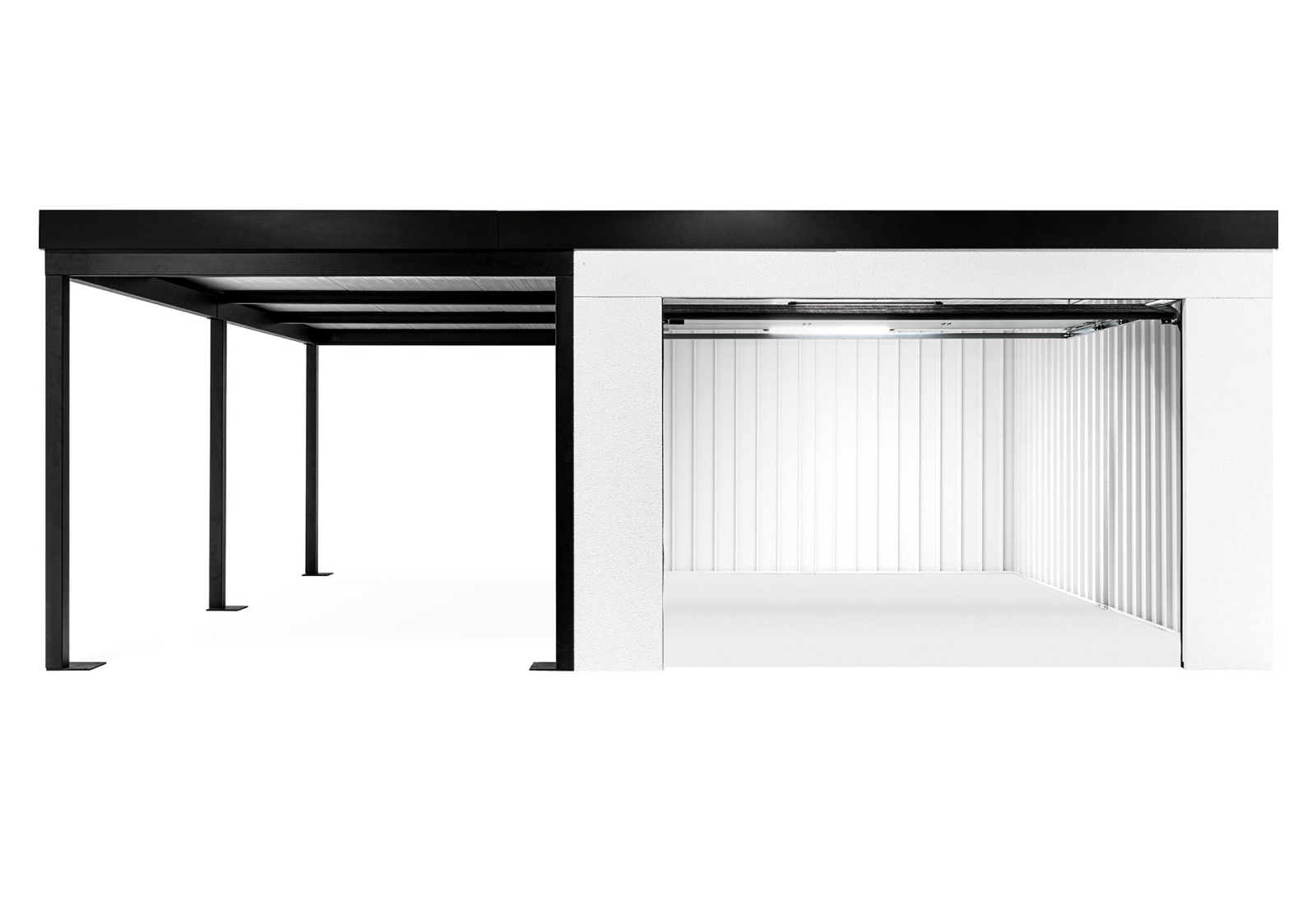 Garáž snů existuje! Prostorná montovaná garáž se špičkovými garážovými vraty Hörmann má zabudované osvětlení a lze ji napájet solárními panely. Bezpečnostní vrata se šikovně zavírají ke stropu, čímž šetří místo. Ultratiché otevírání a zavírání vrat je skvělým bonusem.