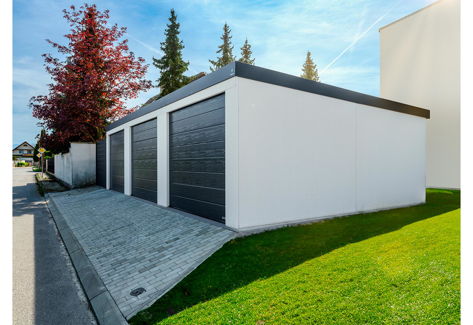 Garáž snů existuje! Prostorná montovaná garáž se špičkovými garážovými vraty Hörmann má zabudované osvětlení a lze ji napájet solárními panely. Bezpečnostní vrata se šikovně zavírají ke stropu, čímž šetří místo. Ultratiché otevírání a zavírání vrat je skvělým bonusem.