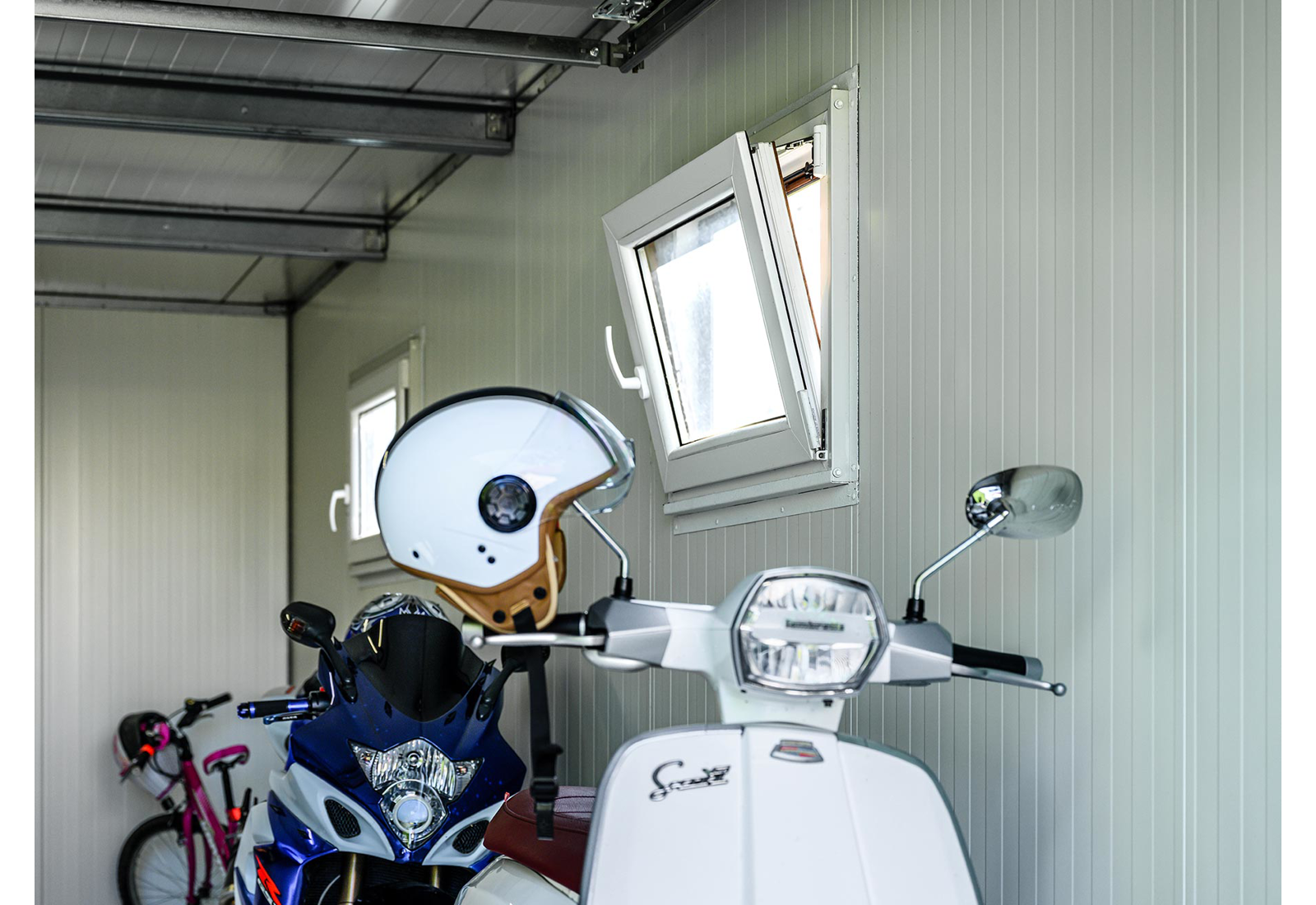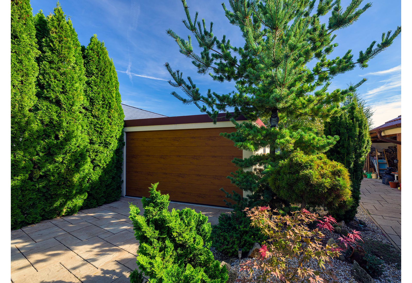 Garáž snů existuje! Prostorná montovaná garáž se špičkovými garážovými vraty Hörmann má zabudované osvětlení a lze ji napájet solárními panely. Bezpečnostní vrata se šikovně zavírají ke stropu, čímž šetří místo. Ultratiché otevírání a zavírání vrat je skvělým bonusem.