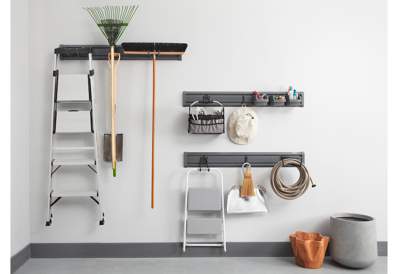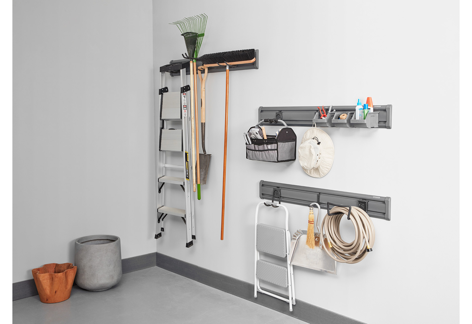 Nástěnné kolejnice GearTrack® tvoří základ propracovaného nástěnného systému Gladiator® a umožňují bezpečně ukládat předměty zavěšením nad podlahu. Skvěle šetří místo na zemi a zajišťují dokonalou organizaci pracovního náčiní od hadice a smetáčků až po skládací schůdky nebo drobné předměty. Tyto dva nosníky dlouhé 122 cm jsou navrženy tak, aby zvládaly extrémní teploty, chlad a vlhkost a lze je používat společně nebo samostatně.