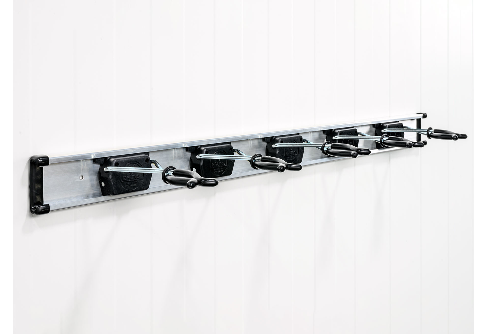 Sestava závěsného systému na nářadí - s 0,75 m dlouhou nosnou lištou a pěti univerzálními držáky.