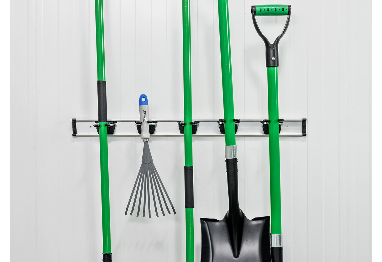 Umožňuje tak udržet v pořádku vše, co potřebujete - od hrábí a rýčů až po pily a sekery. Vše přehledně uspořádané a snadno dostupné.